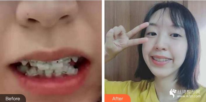 牙齿整齐了很多,现在的嘴巴从侧面看好了很多,人也变得自信爱笑起来了,医生说还要带差不多半年就可以摘牙套了,摘完牙套后每天晚上带上透明的保持器就可以了。